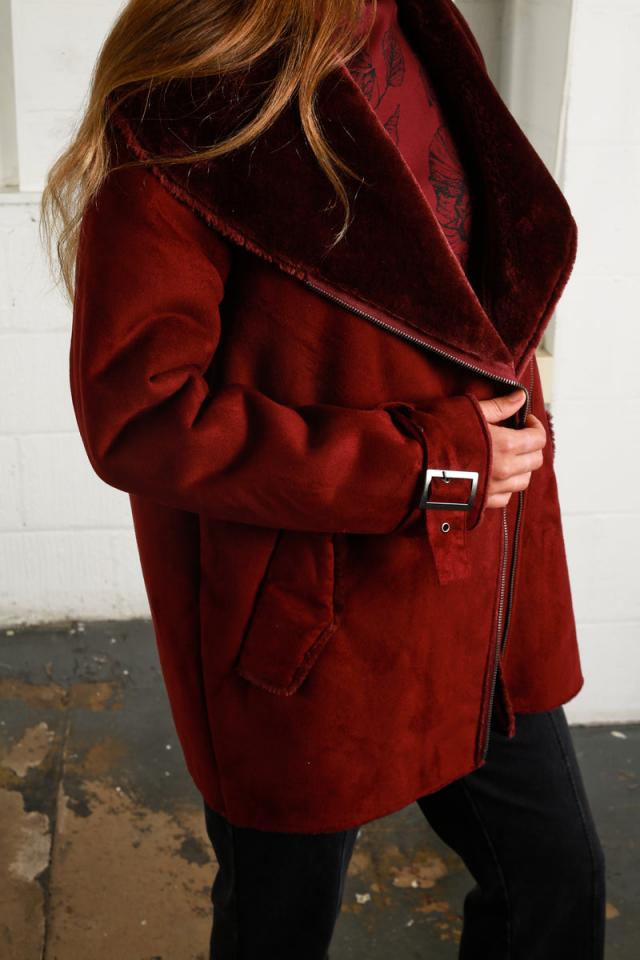 Description Delivery & Returns Introducing a AW18 favourite. The Hacienda Aviator is a burgundy, plush over sized aviator jacket with faux fur lining and collar. Featuring a front zip fastening and buckles on the cuffs. The flap pockets include press stud closures. URSULA IS 5’6″ AND WEARS A SIZE XS RELAXED FIT NYWJK164 | WOVEN:100% POLYESTER